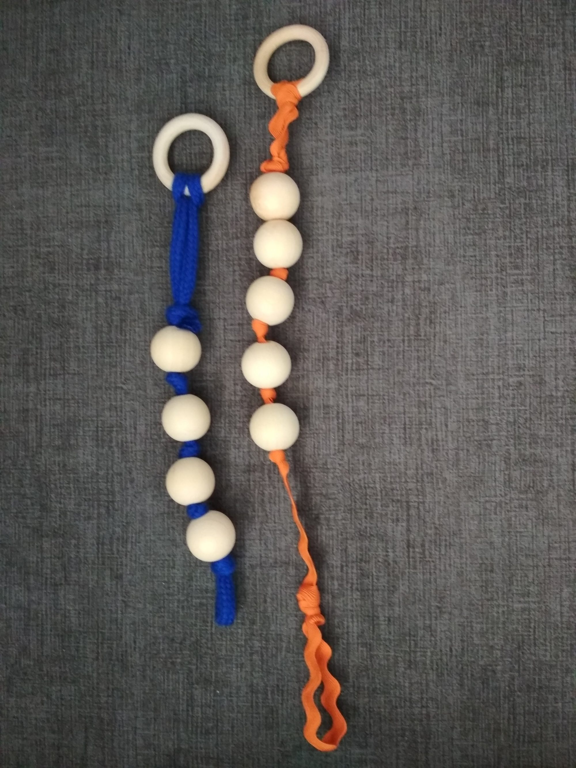 Esto no significa que si vuestro bebé se está desarrollando con libertad de movimiento no podáis ofrecerle estos mismos materiales. Sin embargo, deberemos adaptar la disposición de estos presentándolos en el espacio de juego de una manera diferente para dar respuesta a sus necesidades de movimiento. Es decir, se los dispondremos esparcidos por el espacio separados, de uno en uno o en pequeños grupos. Por ejemplo, podemos poner varios cestos o cuencos más pequeños con objetos de un tipo de material o mezclados, cada uno en un lugar del espacio de juego.